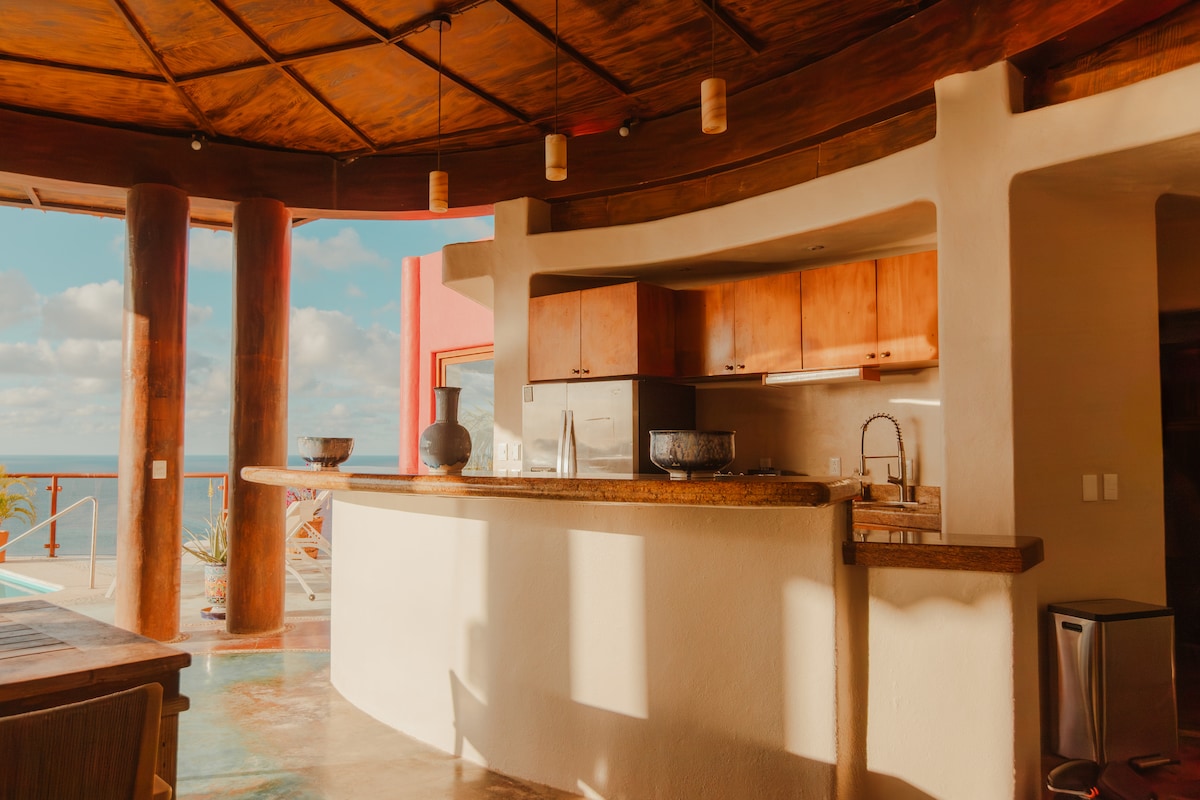 Casa Luna, vår romantiska tillflyktsort, har en hängande queen-size-säng på övervåningen med en spektakulär utsikt över havet. Det finns också en sittgrupp och en hängmatta byggd för två. På nedervåningen finns en stationär dubbelsäng och en dubbelsäng/soffa. Luna har ett fullt utrustat kök med utsikt över havet. Spisen är en fyra-brännare, tyvärr ingen ugn.