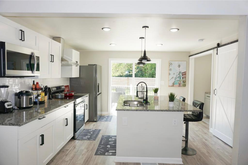 Koppla av i denna lugna, eleganta 3 sovrum/2 fulla badrum övre nivå enhet. Ett annat Airbnb finns i den färdiga källarenheten. Utrymmet är helt ditt och ingen tillgång till den andra källarenheten. Det enda delade området är altanen på baksidan. Enheten har ett helt uppdaterat kök med rostfritt stål och granit. Sovrummet har en superbekväm queen-säng och ett badrum som har en vacker dusch. Gästrummet har en annan dubbelsäng och kontorsområdet har en futon. Elegans och romantisk boho-stil överallt!