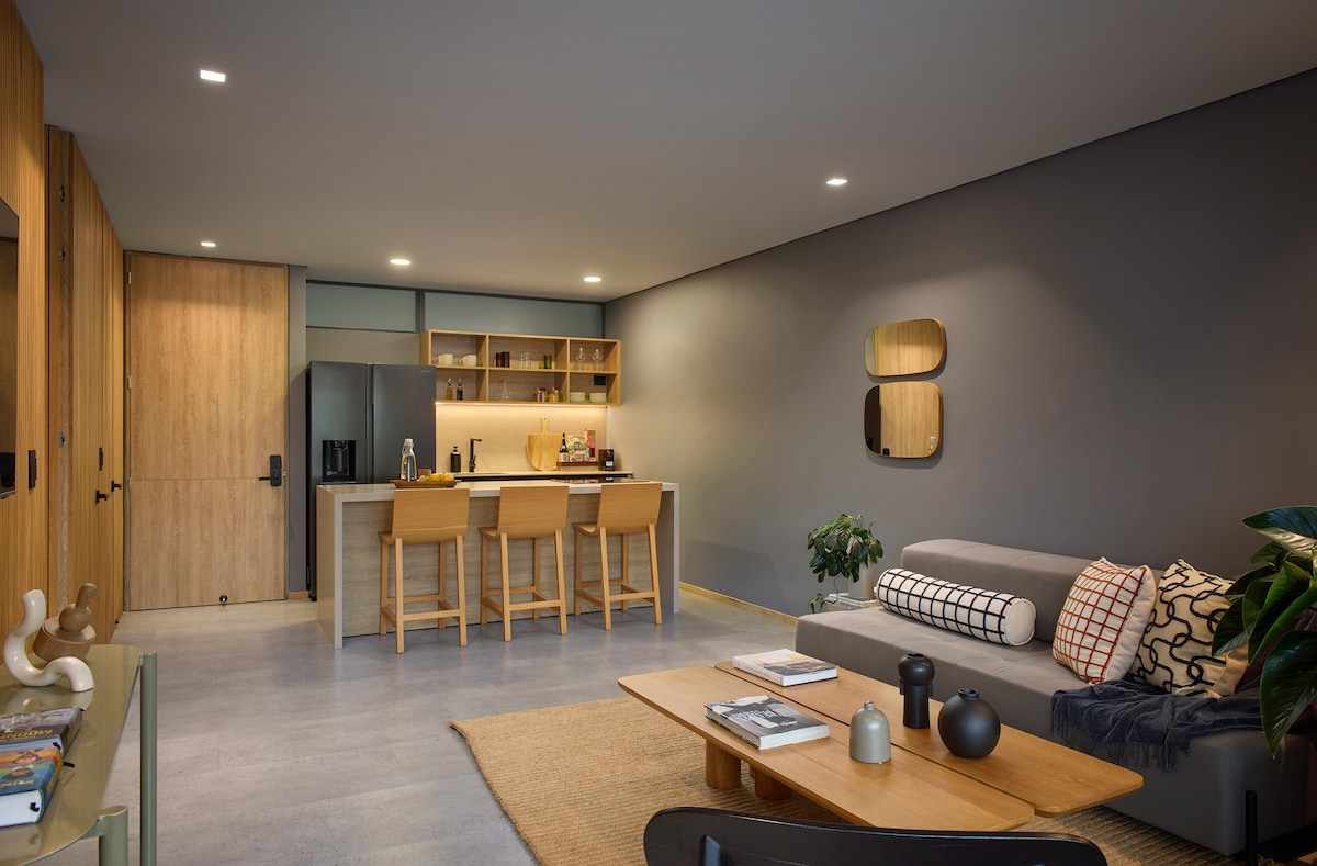 Denna rymliga lägenhet kombinerar moderna utseende med högt i tak för dig att njuta av medan du har en trevlig morgon av att arbeta med vår höghastighetsinternetanslutning. Du kan ta en god kopp kaffe medan du har ett Zoom-möte och ha det bästa vädret i världen för att följa dig. Om du missar något till frukost eller lunch, oroa dig inte, du kan gå ett eller två kvarter och hitta allt du behöver för att ha lite rostat bröd och ägg på ditt bord eller ditt skrivbord om du är lite sen till ett möte.