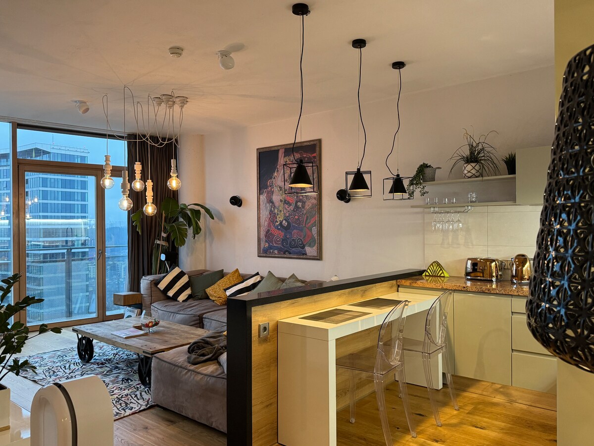 Modern design, på översta 24:e våningen i en känd skyskrapa. Stora fönster erbjuder fantastisk utsikt över staden och bortom. Lägenheten har många faciliteter, ett stort badrum med en masserande jacuzzi och ett högkvalitativt hemmabiosystem med OLED-TV och 12 högtalare runt omkring. Det ligger ovanför ett köpcentrum, med Gamla stan på ena sidan och det nya affärsdistriktet på den andra, båda inom gångavstånd. Perfekt för par, affärsresenärer och familjer.