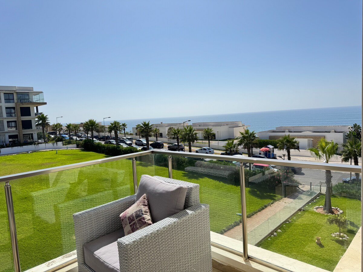 Familjelägenhet vid stranden – Prestigia Plage des Nations 20 minuter från Rabat-Salé flygplats. Annonsen: -1 master suite med eget badrum och egen balkong vid stranden -1 sovrum med två enkelsängar - Rymligt vardagsrum, 1 person kan sova där om det behövs - Matrum - Möblerat kök - Draperier, handdukar, väsentligheter ingår - Wi-Fi/TV + IPTV - Privat parkeringsplats - Pool (stängd utanför sommaren), tillgång till strand, lekplats Rökfritt boende