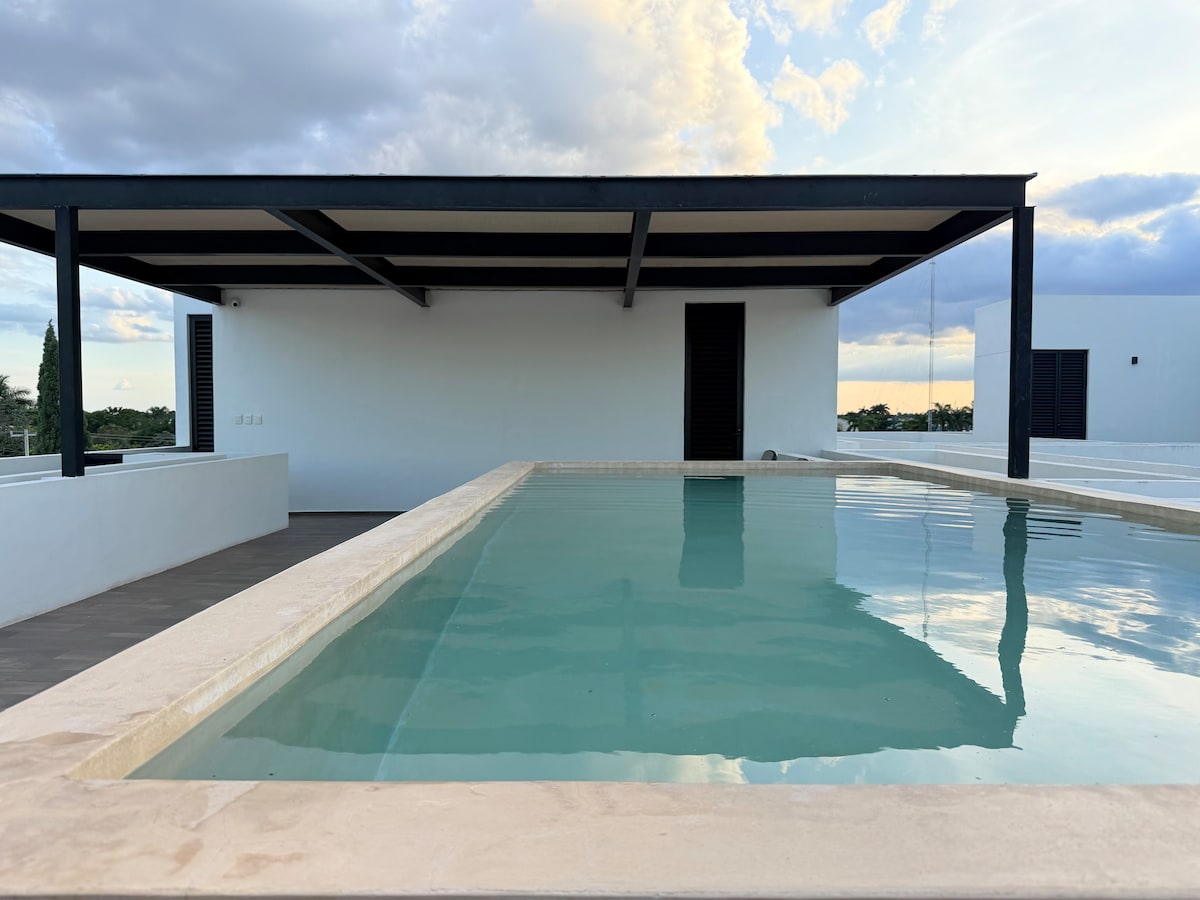 Lägenheten ligger i det bästa bostadsområdet i Mérida. Det är ett komplex med två lägenhetstorn, lyxiga bekvämligheter och många gemensamma utrymmen för gästerna. Den ligger i norra delen av Mérida med alla tjänster några minuter bort. Det är en lägenhet med 1 sovrum, komplett privat badrum och en matsal med kök utrustat för 2 personer. På komplexets tak kan du använda baren, grillen och poolområdet som gemensamma områden i komplexet.