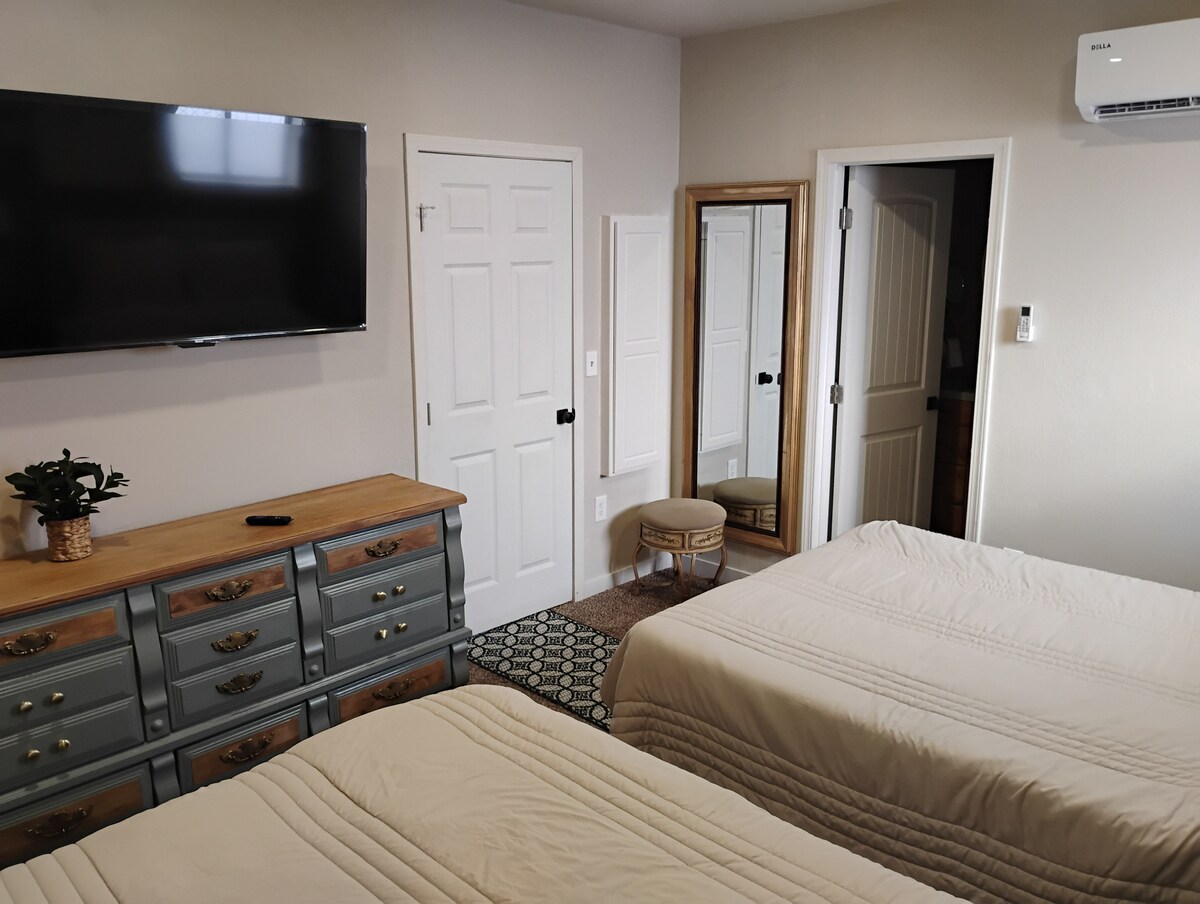 Välkommen till vår mysiga, varma tillflyktsort – ett enkelt ställe att sakta ner och känna sig som hemma. På kalla dagar, tänd eldstaden och låt utrymmet värmas runt dig, med två tysta mini-splits kan du anpassa till din komfort. Sovrummet har två queen-sängar, plus en futon för extra utrymme. Ett enkelt pentry, tvättmaskin/torktumlare och Roku-TV gör det enkelt att slå sig ner och koppla av.