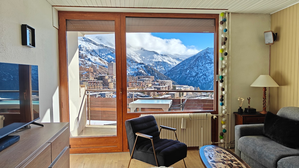 Logement familial proche de tous les sites, des pistes et commerces via l'escalator de la station et du parking couvert et sécurisé. Composé d'une entrée avec coin nuit, d'une salle de douche avec WC et d'un grand séjour avec coin cuisine. Jusqu'à 7 personnes (idéal pour 5) Très ensoleillé et doté d'un balcon avec vue sur les montagnes. Il a une pièce équipé de casier à ski juste en face de l'appartement. Entrée et sortie autonome.