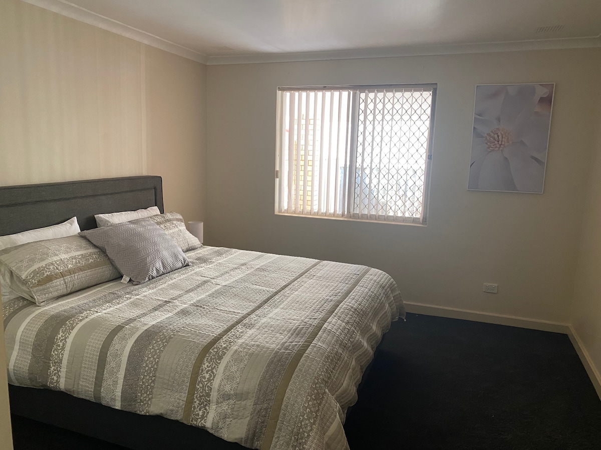 Njut av en kort eller lång vistelse i ett modernt möblerat 4 sovrum tegelhus. 2 duschar, 1 med badkar och 2 toaletter. Nya sängar och möbler som rymmer 9 personer. Evap luftkonditionering och individuell elektrisk rumsuppvärmning. Kort promenad till lokal taverna, gym, golfklubb, rekreationscenter och restaurang. 10 minuters promenad till stadens centrum. Merredin rock/railway dam i närheten. Lugnt stadsområde för en lugn vistelse. Dubbel uppfart, gott om parkeringsplats. 1 NATTS BOKNINGAR vänligen fråga eftersom vi kan komma att kunna boende.