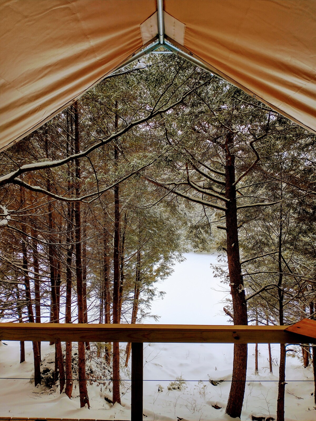 Vi erbjuder ett vackert, BEKVÄMT alternativ till camping. Vårt off grid-tält kommer med alla bekvämligheter hemifrån, inklusive en vedspis och läshörna! Det ligger inbäddat i en hemlocklund med utsikt över den aktiva bäverdammen. Vandringsleder och lokala aktiviteter på ett stenkast. Om du har en liten båt eller kajaker — TA MED dem! Vi har utrymme på gården och massor av lokala platser att skicka dig till för att få bra användning av dem. Använd inte på vår damm. Vi har en båt tillgänglig för användning.