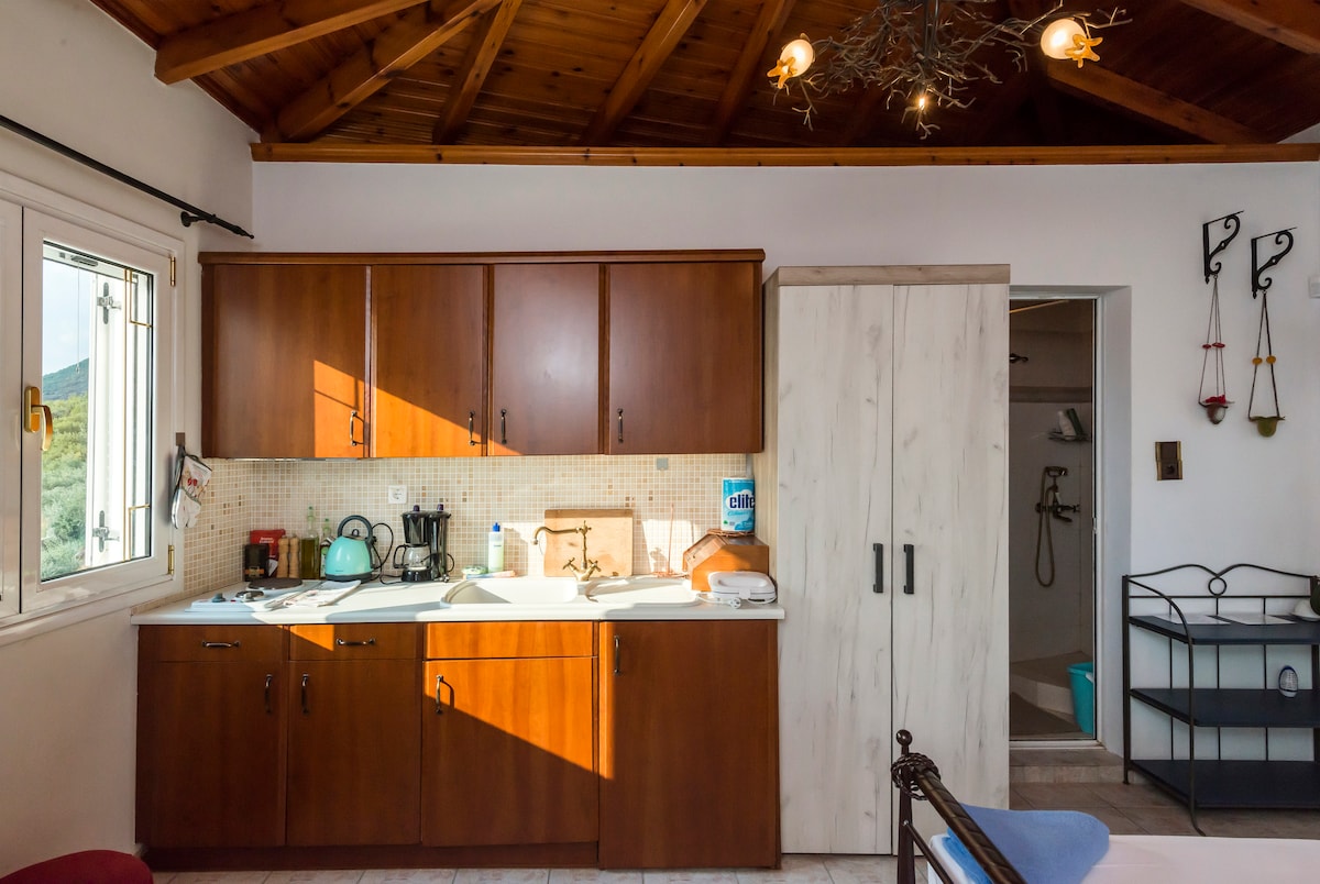 Välkommen! καλωσόρισμα Detta loft i ett gammalt stadshus är allt du behöver för en bra semester i Grekland. Mitt i den lilla staden COVIDoni i sydvästra delen av Peloponnesien står villan "Ett olivträd, en citron och ett hus". Det är ett renoverat autentiskt grekiskt stenhus. På bottenvåningen har vi en rymlig studio / loft med ett eget matlagningsområde - 500 meter till stranden och ca. 25 minuter med bil till nästa golfbana. -- Färdigställt 2019, ny luftkonditionering 2023