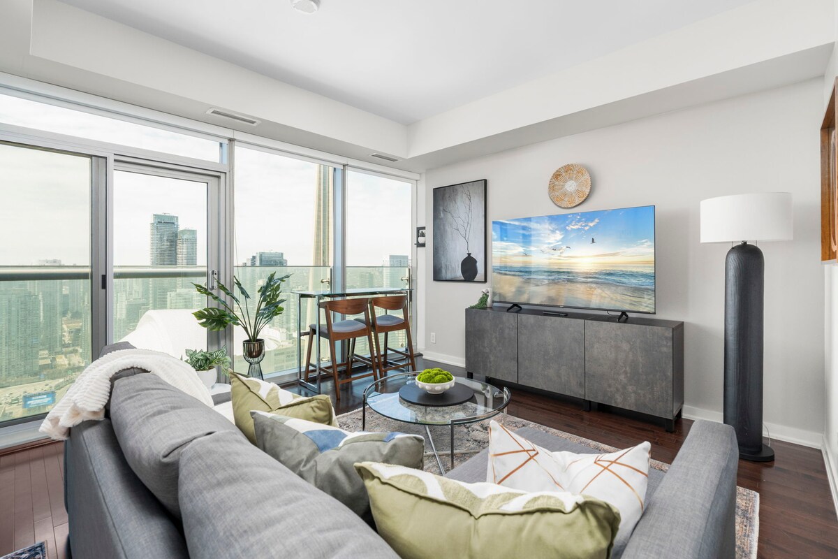 Kliv in i den moderna och eleganta lĂ€genheten med 1 sovrum och 1 badrum pĂ„ 40:e vĂ„ningen i hjĂ€rtat av centrala Toronto. Den lovar fantastisk panoramautsikt över CN Tower, Rogers Center, den pittoreska sjön och mycket mer. Utforska staden innan du drar dig tillbaka till denna underbara pĂ€rla vars miljonvĂ€rda utsikt och rika bekvĂ€mlighetslista kommer att lĂ€mna dig i vördnad. â Panoramautsikt över staden och sjön â BekvĂ€mt sovrum â Vardagsrum med öppen design â Fullt utrustat kök â Smart TV â Höghastighets-Wi-Fi â TvĂ€ttmaskin/torktumlare Se mer nedan!