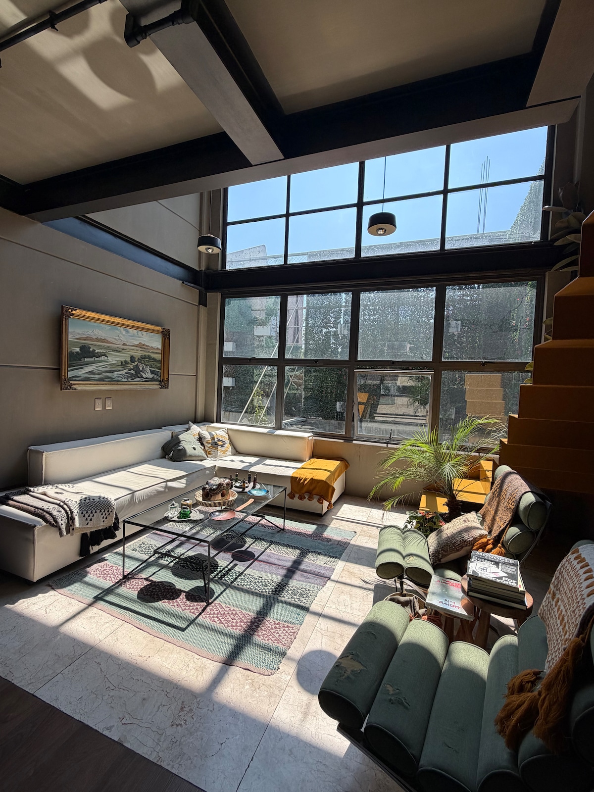 Konstnärlig Townhouse Loft med gott om ljus är ett underbart utrymme som fångar mycket naturligt ljus genom fönstren med dubbel höjd. Det är ett litet museum och en oas av växter mitt i staden. En mycket eklektisk stil från mexikanska hantverksföremål från Chiapas, Guatemala och Michoacan till samtida och antik konst och möbler från olika tidsperioder från hela världen. Publicerad i Paper and Pate som: "Colorful Mexico City Home Featured by Nyde" glada att dela artikeln.