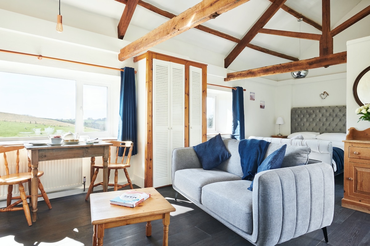 Denna privata lada har allt du behöver för en lugn tillflyktsort. På en lugn och privat egendom, bara 10 minuters bilväg till Bude stränder. Använd grillhuset, utomhusduschar, eldskål, bubbelpool och bastu innan du bosätter dig vid vedeldaren och Smart TV. Perfekt för par. Inga spädbarn eller barn under 12 år. 2 gäster har tillgång till huvudsoverummet och eget badrum, grupper om 4 har tillgång till båda sovrummen/badrummen. Endast 1 hund. Fullt inhägnad trädgård, hundsäker. Ett måste för en avkopplande tillflykt och avstressning
