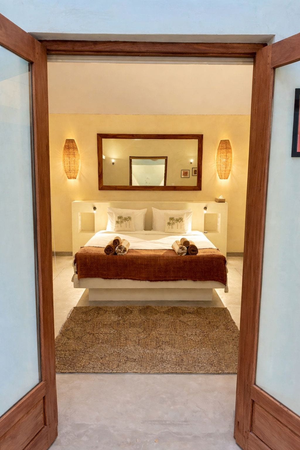Cocoya är en fungerande kokos- och kanelodling. Palamu ligger på en liten kulle med utsikt över våra kokosnötsträd. Den är utformad som en förlängning av odlingen. Ett halmtak, lerväggar, höga kokospelare. 2 sovrum flankerar vardagsrummet och öppet kök och är utrustade med dubbelsängar och eget badrum. Regnduschar i det fria är en upplevelse i sig själv esp. i skymningen med en strålande solnedgång, svajande kokosträd och kallt rinnande vatten efter en varm dag. Vi har ingen luftkonditionering.