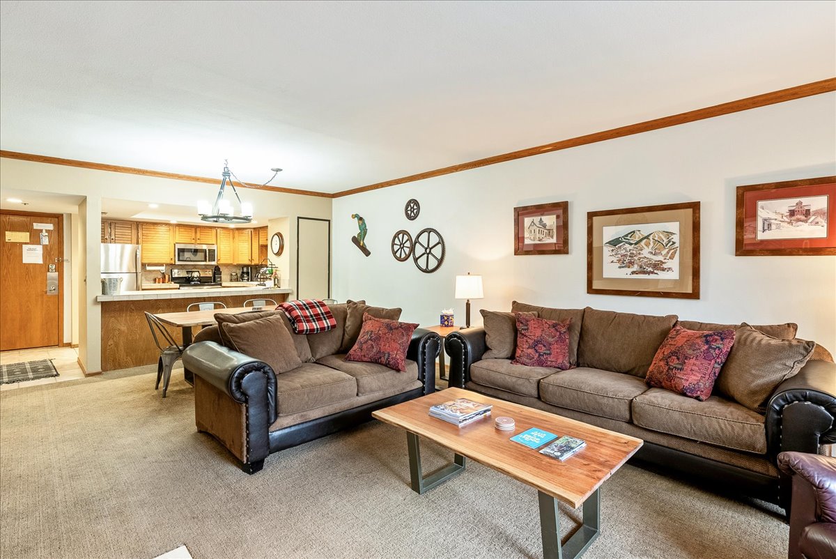 Detta är ett nyrenoverat 2 sovrum med en lyxig King Master, samt en Queen säng med en barnsäng i 2:a sovrummet. Det finns ett fullt utrustat kök och matplats. Vardagsrummet har en FP, Smart TV med en soffa, 2 loungestolar med utsikt över semesterorten bara några steg bort. Personlig förvaring för skidor och snowboards i anslutning till enheten. Den uppvärmda utomhuspoolen och bubbelpoolen är en stor hit bland gäster och ett utmärkt sätt att varva ner efter en lång dag av shredding. Stadsbussystemet är gratis med stopp utanför.