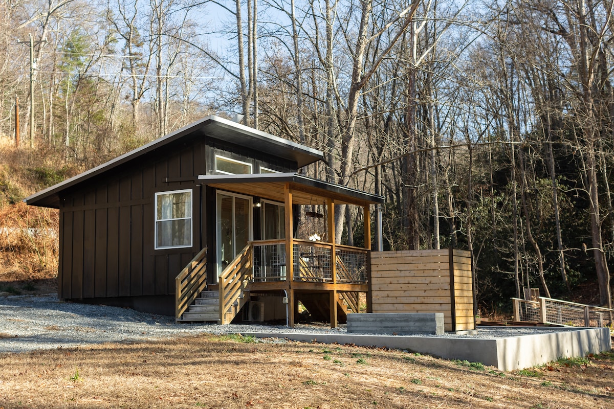 Kontrollera med värdar om datumen är blockerade. Privat 385 kvm oas med stort däck och liten, hundvänlig inhägnad trädgård på 1 hektar inbäddad i en privat dal i Pisgah Nat. Skog strax utanför Ashevile med utsikt över bergen! 2015 timmerstuga har fullt utrustat kök, vardagsrum, badrum och 1 sovrum (queen). Vardagsrummet har en smart-TV och mysig öppen spis! Uteplats med gasolgrill och al fresco matplats. Uteplats med Chiminea. Max 2 gäster.