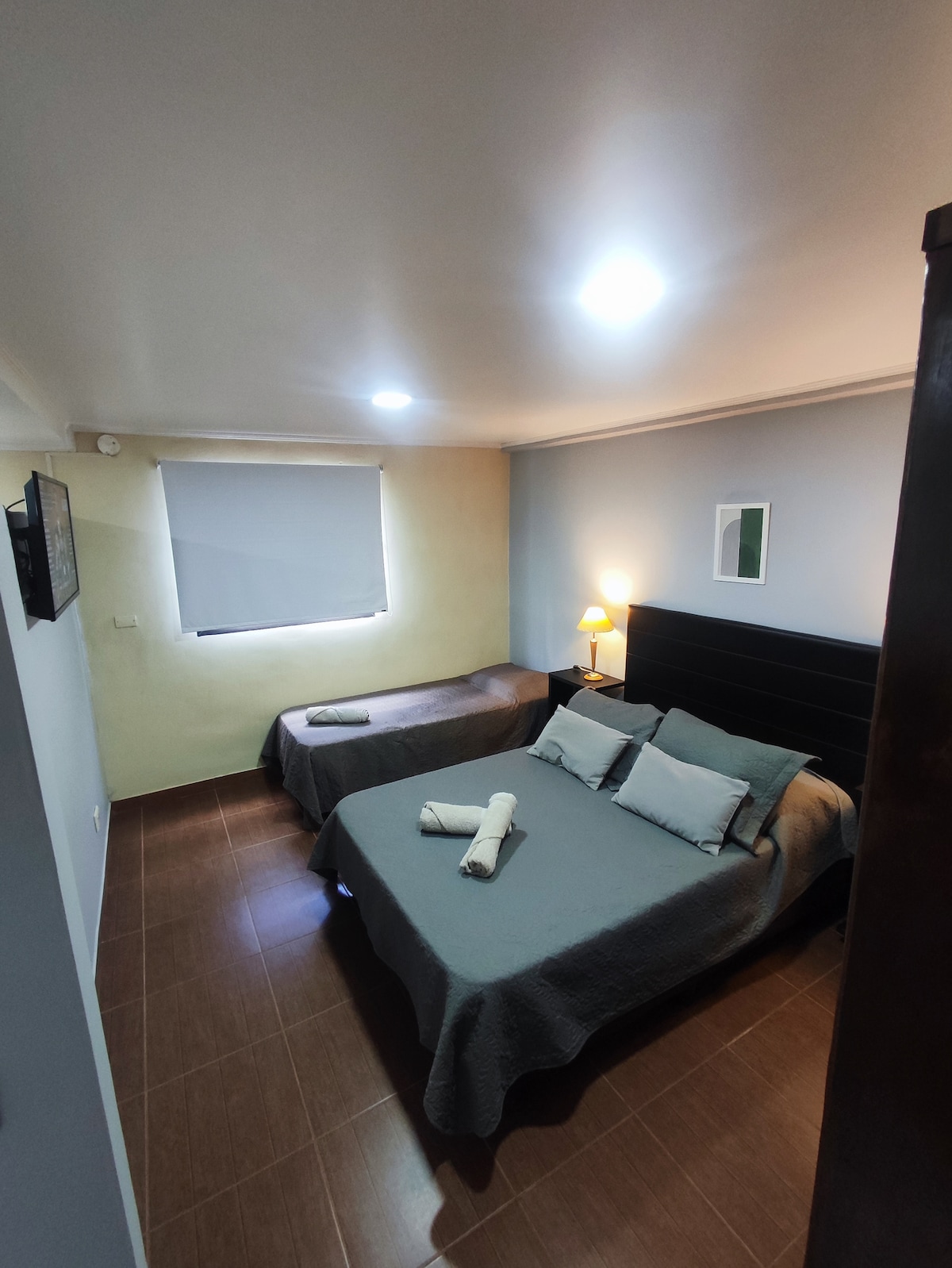 2-våningshus På bottenvåningen: kök, matrum, förbadrum, badrum. Uteplats med grill. Bottenvåningen: Ett rymligt sovrum med 1 dubbelsäng och tre enkelsängar med luftkonditionering och TV. Mitt i sovrummet finns en garderob som delar upp sektorerna för att ge avskildhet mellan dubbelsängen och de andra sängarna. Beläget i ett lugnt grannskap, 1 km från centrum. Wi-Fi-tjänst är tillgänglig Lakan, handdukar och handdukar. Parkering inne i utomhusfastigheten.