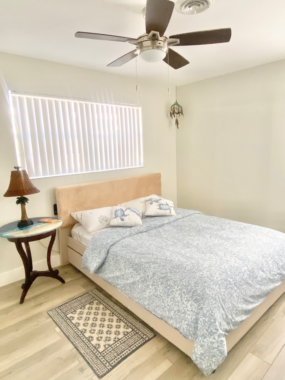 Lyxig privat studio med privat ingång (440 kvadratfot — rymmer 3 personer/2 bilar) är ansluten till vårt hem och 1,7 miles från stranden och intill Ft Lauderdale. Parkera under den täckta carporten. 1 Queen Bed (& 1 Queen Size-Blow Up Mattress), 1 Bad, Pentri, Fiber Optic Wifi, Flat Screen TV (140 kanaler), Impact Windows, Enorm garderob, Fläkt/ljus, AC med fjärrkontroll, Skrivbord, Stol, fäll upp/ner Bord för att äta med stolar, litet kylskåp, mikrovågsugn, brödrost, Foreman Grill, värmeplatta, kaffebryggare.