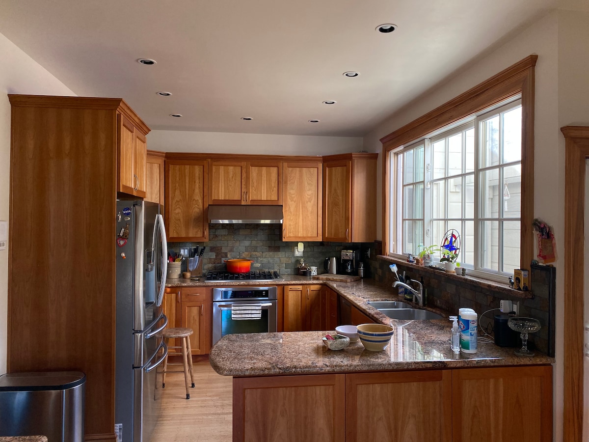 Rymlig, modern renovering med en riktig öppen spis! Solljus hela dagen, stora fönster överallt! Perfekt arbete hemifrån, lugn vistelse. Superhastighets WiFi, flera arbetsutrymmen, inkluderar kontor med skrivare, vit bräda. Uteplats i huvudsovrum. Gratis parkering, säkerhetskamera. Kök laddat för hemmakocken. Peloton, Sonos, Apple TV, piano. Säkert område, produkter, apotek gångavstånd. Ocean Beach, löpspår, Golden Gate Park i närheten. Professionell rengöringsrutin. Djurvänligt.