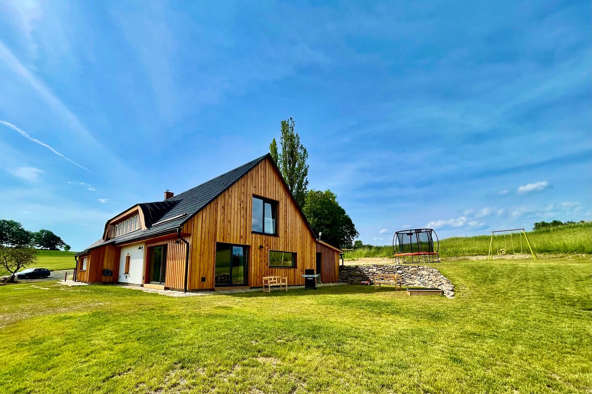 Kom och koppla av från det hektiska livet i vårt hus i hjärtat av Podkrkonoší. All komfort från varmt vatten till luftkonditionering är en självklarhet hos oss. Den inglasade terrassen gör att du kan njuta av den omgivande naturen från bekvämligheten inomhus. Här kan du njuta av morgonkaffe eller en romantisk middag. Det finns ett fullt utrustat kök och en utomhusgrill. Och wellness? I vår utomhusbubbelpool under bar himmel kommer du att glömma alla bekymmer!