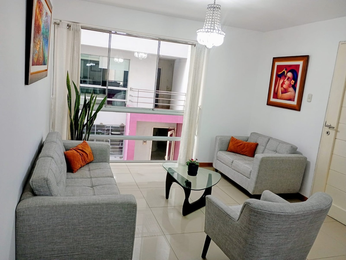 ✅7 kvarter från Golf and Country Club ✅5 kvarter från Doubletree By Hilton Hotel ✅6 kvarter från Hotel Costa del Sol Wyndham ✅5 minuter från Real Plaza Shopping Center ✅8 minuter från UPAO och UCV University ✅15 minuter från Plaza de Armas i Trujillo ✅25 minuter från Huanchaco ✅Nära exklusiva restauranger och nattklubbar 🛒3 kvarter från MASS-butiken och 4 kvarter från DollarCity Det har: ✅Termiskt bad ✅WIFI 🎥 Netflix och YouTube Premium ⚠️Efter bokning är det nödvändigt att skicka ett foto av gästernas ID.