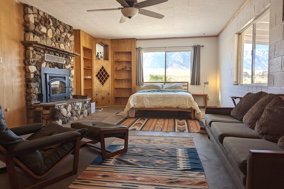 Designed and inspired by the rocks of the Alabama Hills, this spacious unique dwell studio intercepts with the breathtaking views of Mt. Whitney and the Eastern Sierra. Close to Whitney Portal, Horseshoe Meadow, and other famous trails, it’s excellent for day hikes. We are in the epicenter of the lowest (Death Valley) highest (Mount Whitney) and oldest (Bristlecone Pine Forest)