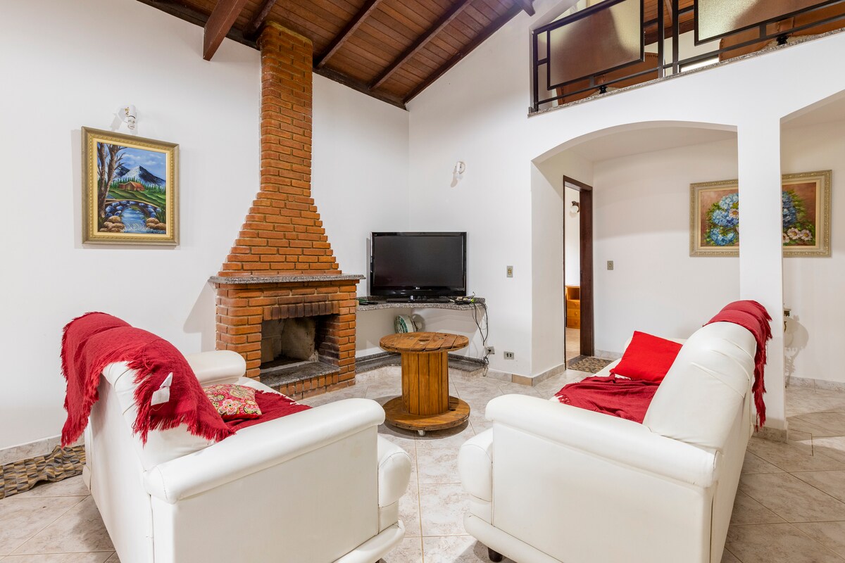 Maximal kapacitet 24 personer och ytterliggplatser för två barn. Gård i Mogi das Cruzes med mycket grönområde, pool för vuxna och barn, lekplats, festlokal med grillplats, pizzaugn, bordtennisbord, biljard och fotbollsbord, omklädningsrum M/F och badrum, boccia och sportfiske i sjön. Fotbollsplan och basket-/volleybolls-/pickleballplan. Hus med 6 sviter, 1 sovrum, toalett, kök med bord för 12 personer, vardagsrum med 5 soffor, ett bord för 8 personer, öppen spis inomhus och utomhus, TV och skafferi