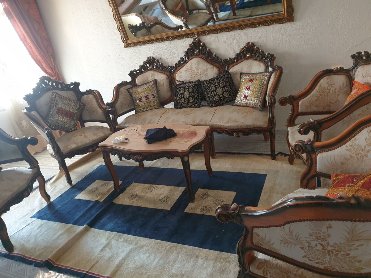 Upptäck charmen i Ksar Hellal, från vårt lugna familjehem! Beläget i ett centralt beläget grannskap, erbjuder vårt rymliga tvåvåningshus enkel tillgång till lokala attraktioner och närliggande städer som Monastir , Sousse och Mahdia. Ksar Hellal är känt för sin livliga textilindustri och rika kulturarv och ger en unik bakgrund för din tunisiska semester. Oavsett om du besöker familj i närheten eller utforskar skönheten och historien i denna fascinerande stad, kommer vi gärna att hjälpa till.