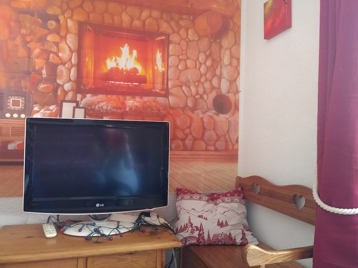 "Chalet Spirit" -studio idealiskt beläget, vid foten av backarna, längdskidåkning, vandring, snöskor. Bostad med hiss, gratis bil, skidskåp. På plats, biljettkontor, uthyrningsbutiker för utrustning, dagis, skidskola, restaurang, gratis transfer (endast på vintern), tågstationstransfer. Består av: bergshörn (2 våningssängar), vardagsrum med 1 konvertibel 2-sits clic-clac, utrustat kök, TV, balkong med utsikt över backarna, badrum (badkar), oberoende toalett.