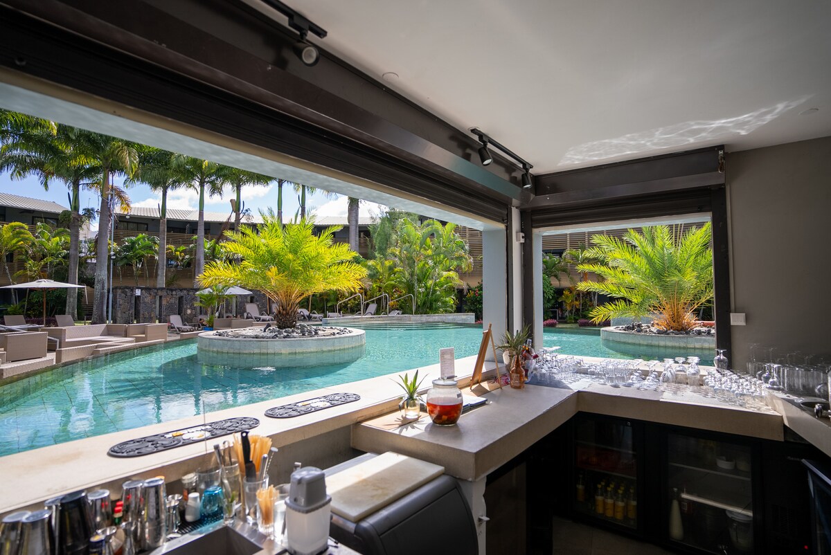 Denna eleganta lägenhet erbjuder en idyllisk miljö för en oförglömlig semester. Bostad med 2500 kvm lagunpool utrustad med solstolar och omgiven av kokosnötsträd , gym (mot en avgift), bevakning dygnet runt, privat parkering, gratis Wifi Perfekt läge 3 min från Mont Choisy strand och nära golfbanan. Närheten till Grand Baie gör att du kan njuta av köpcentra, restauranger och livliga nattliv i området. Perfekt för semester med familj, vänner eller par.