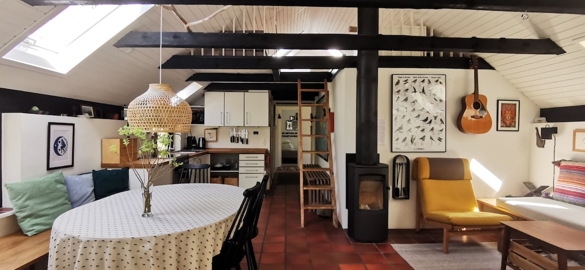 Denna byggnad, som ursprungligen var listad som ett häststall 1832, omvandlas nu till ett charmigt hem med eget kök och toalett. Perfekt för en weekend getaway eller ett stopp längs vägen på cykelsemestern. På bottenvåningen hittar du ett öppet kök och vardagsrum i ett, med tillgång till en privat terrass samt ett badrum. På bottenvåningen finns ett rymligt rum med fyra enkelsängar och utsikt över havet från ena änden av rummet. Boendet måste lämnas i samma skick som vid ankomst.