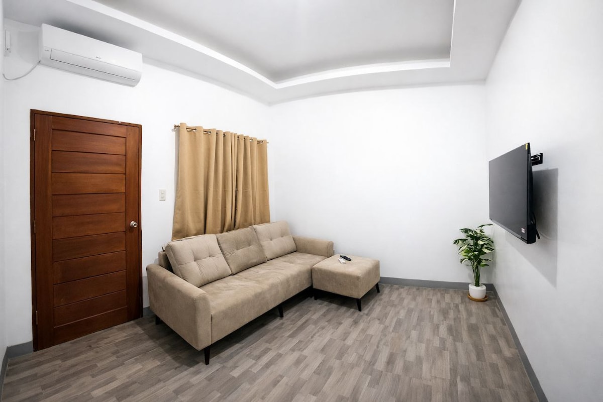 Welcome to your stylish urban retreat! This bright, open-plan unit features a fully equipped kitchen/dining area, a comfy living room, and a restful bedroom. Enjoy seamless indoor-outdoor living with your own private patio, perfect for morning coffee/evening relaxation. Designed for both comfort and practicality, it's your ideal home base for exploring the city. this space is designed to make you feel settled and refreshed from the moment you arrive. SM Urdaneta 2.6km 🚬 is only allowed outside.