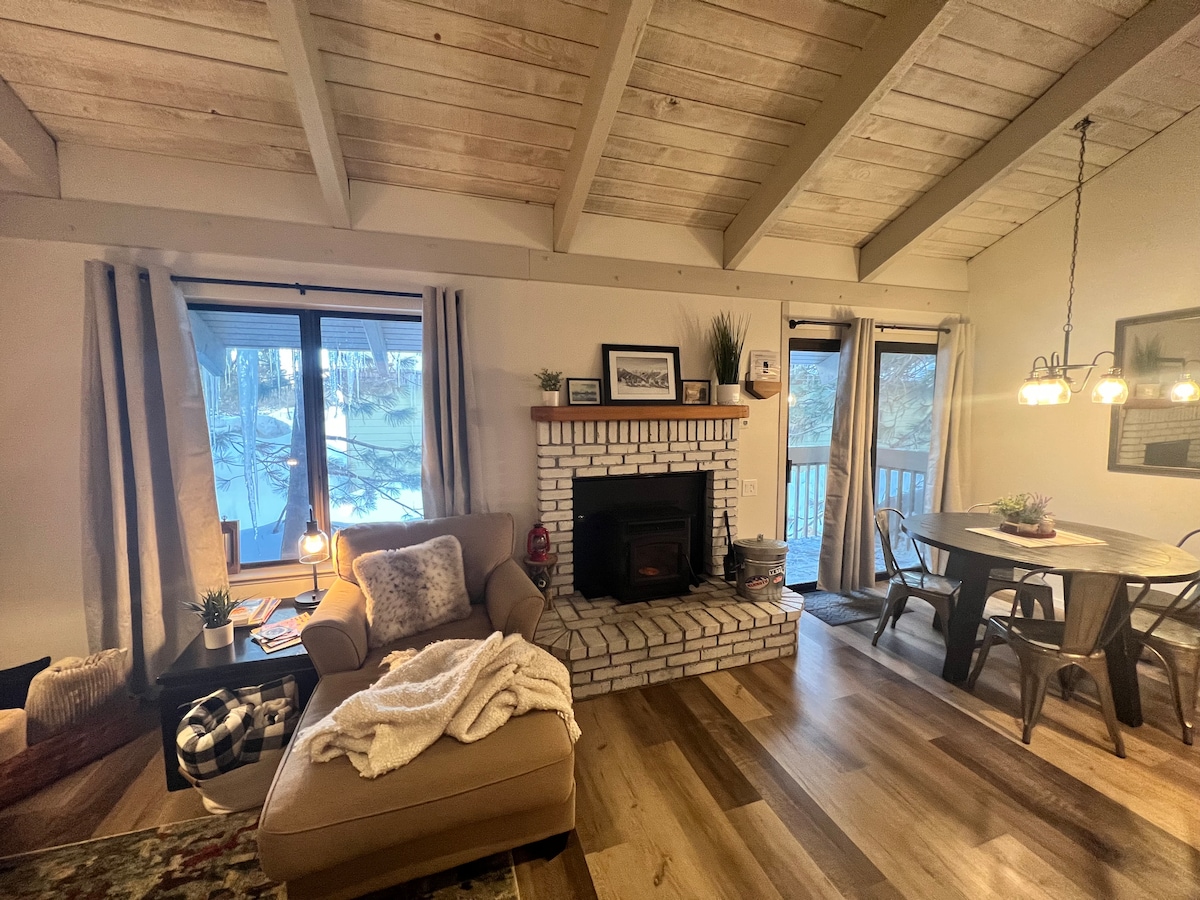 Denna rymliga, ljusa och ombyggda 1bd 1ba lägenhet i Sunrise-komplexet rymmer 4 och är det perfekta stället att koppla av efter att ha utforskat allt som Mammoth Lakes har att erbjuda. Njut av kaffe på den privata uteplatsen med utsikt över Sherwin's och koppla av i säsongspoolen och/eller bubbelpoolen innan du chillar på soffan bredvid eldstaden. Det finns gott om parkering för släpvagnar och förvaring för din utrustning oavsett om du besöker för skidåkning, cykling, fiske, vandring, golf eller båtliv.
