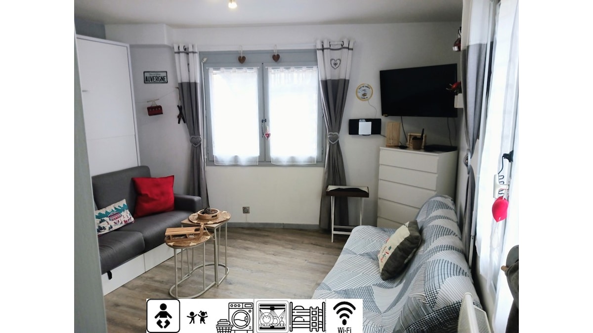 Fantastisk lägenhet på 28 m2 (klassad 1 stjärna för 4 personer som ligger vid foten av backarna i staden Mont-Dore som ligger 1200 meter över havet. Beläget 200 m från de första liftarna och 2 km från centrum av Mont-Dore. Möblerad lägenhet med kök, ett sovrum, ett vardagsrum, en privat parkeringsplats i källaren och förvaringsrum för skidor.