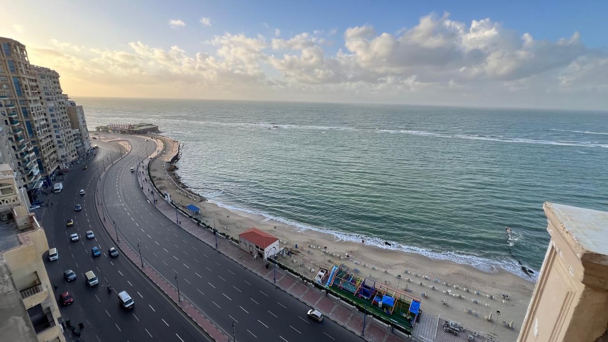En framstående lägenhet på stranden i Alexandria i Montazah-området. Den består av tre sovrum med 6 bäddar, två badrum, en stor hall med en matsal, en salong och ett vardagsrum. Förutom en havsutsikt över hela korridorens bredd. Och en stor balkong med en soffa och stolar gjorda av korg och klassiska pärlor. Lägenheten ligger på nionde våningen, vilket ger den en unik utsikt över stranden som du aldrig kommer att se tidigare.