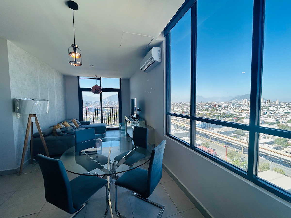 Perfekt boende för ditt nästa besök i Mountain City! Fantastisk lägenhet belägen i ett privilegierat område, precis framför Parque Fundidora, Arena Monterrey och Citibanamex. Det har utsikt över Cerro de la Silla, och ligger i en nybyggd byggnad, där du kan njuta av moderna bekvämligheter såsom gymnasium, grillar, festrum, affärscenter. Depa är bekväm, ren och säker. Tillägnad människor som njuter av en minimalistisk och elegant design.