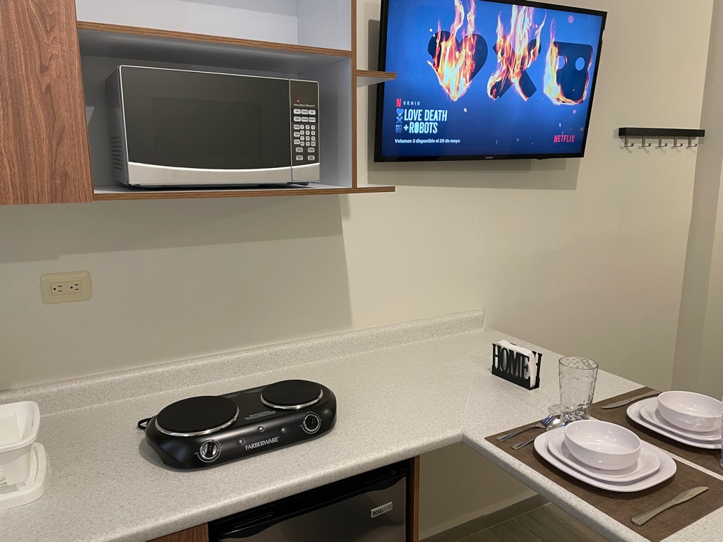 Precioso departamento totalmente remodelado en la mejor zona de san Pedro Garza García. Prácticamente todo nuevo (camas, sábanas, colchones, persianas, refri, lavadora, secadora, sala, comedor, electrodomésticos, climas). Cuenta con Wifi, smart TV con 80 canales, minisplit en cada cuarto y un lindo balcón con hermosa vista a la zona hotelera.