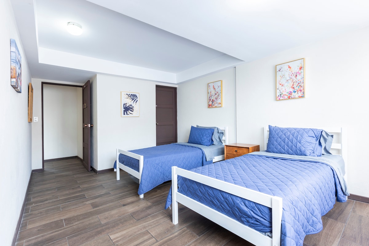 A tan solo 25 minutos del Aeropuerto Internacional Juan Santamaría. Habitación con cama matrimonial . closet, pantalla de TV, baño individual. Internet. Cocina un balcon con mesas , en el tercer piso hay un espacio para hacer yoga y ejercicicios, t ubicados cerca de los más importantes atractivos de la ciudad, restaurantes, centro de compras y supermercados. Además estamos en una casa de arquitectura moderna y con llamativos murales e, con un servicio personalizado.
