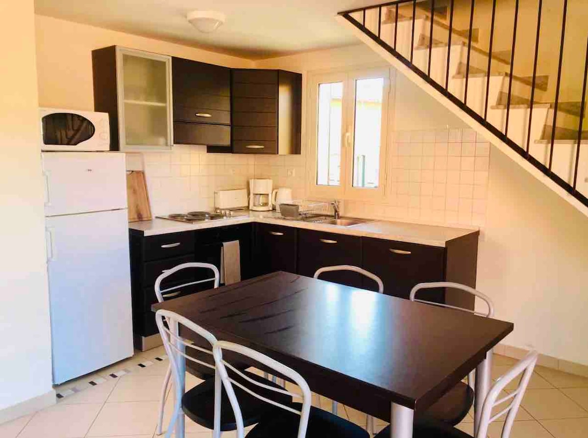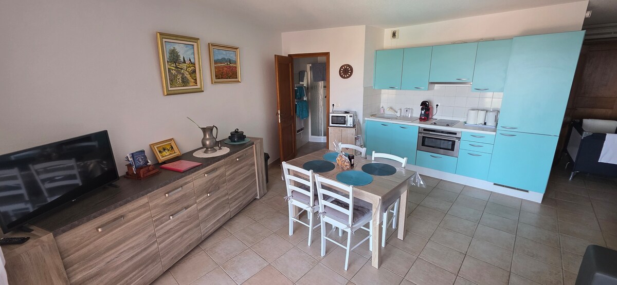 I ett nytt lyxigt boende, mycket trevlig lägenhet för 4 personer, fullt utrustad (wi fi), med kök, matplats-vardagsrum (bäddsoffa 160), ett sovrum med säng 160 och ett badrum, terrass med trädgårdsmöbler och solstol med utsikt över bergen och byarna, privat garage. Lugnt läge, 200 m från alla butiker och sandstranden Njut av den exceptionella fiskmarknaden varje dag.