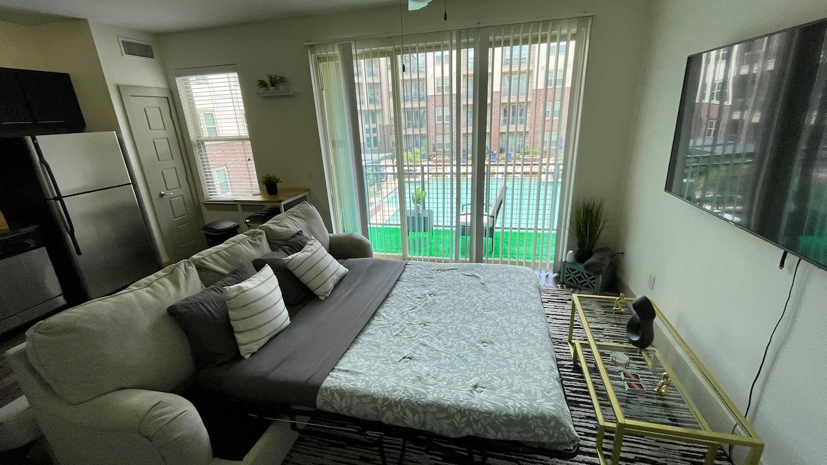 Om utrymmet Detta boende ligger mitt i hjärtat av staden. Perfekt för alla som reser till Houston. Från parken, sportarenor, de bästa restaurangerna och barerna i stan. Allt du behöver ligger bara några minuter bort. Boendet är fullt möblerat med. - HD 55 tums ROKU-TV - En bekväm dubbelsäng - Bord för 2 - Fullt utrustat kök med en keurig kaffebryggare - Höghastighets-WI-FI - Kaffekapslar och snacks - Din egen utsedda parkeringsplats - Husdjursbädd - Skrivbord Vi är naturligtvis husdjursvänliga!