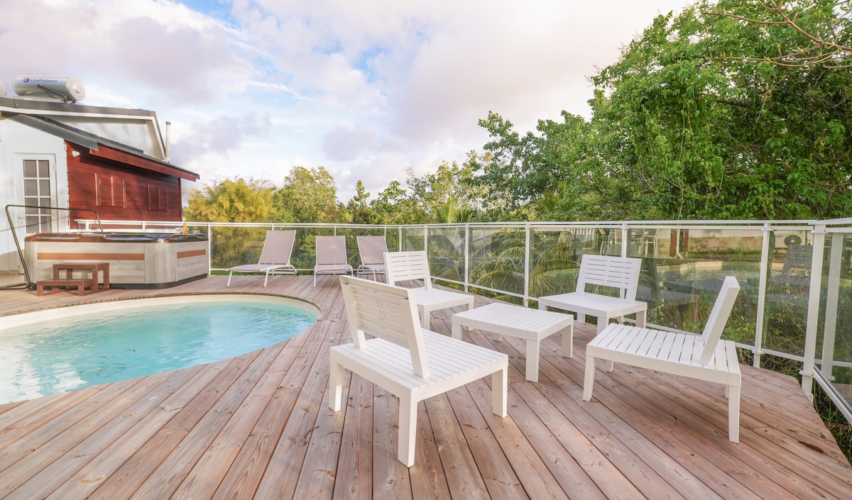 50 m2 trähus med terrass, max 4 personer, privat avkopplingspool med spastrålar i ett lugnt bostadsområde beläget på landsbygden. 5 min. från Edgar Clerc Museum, 8 min. från Baie Side shoppingcenter, 15 min. från Plage de l'Autre Bord & 20 min. från Porte d'Enfer. Koppla av i detta lugna och eleganta boende, du kommer att vara välkommen. Ingen rökning tillåten. Fester är förbjudna. Inga dekorationer för födelsedagar. Ouppvärmd pool. INCHECKNING FRÅN 15:00