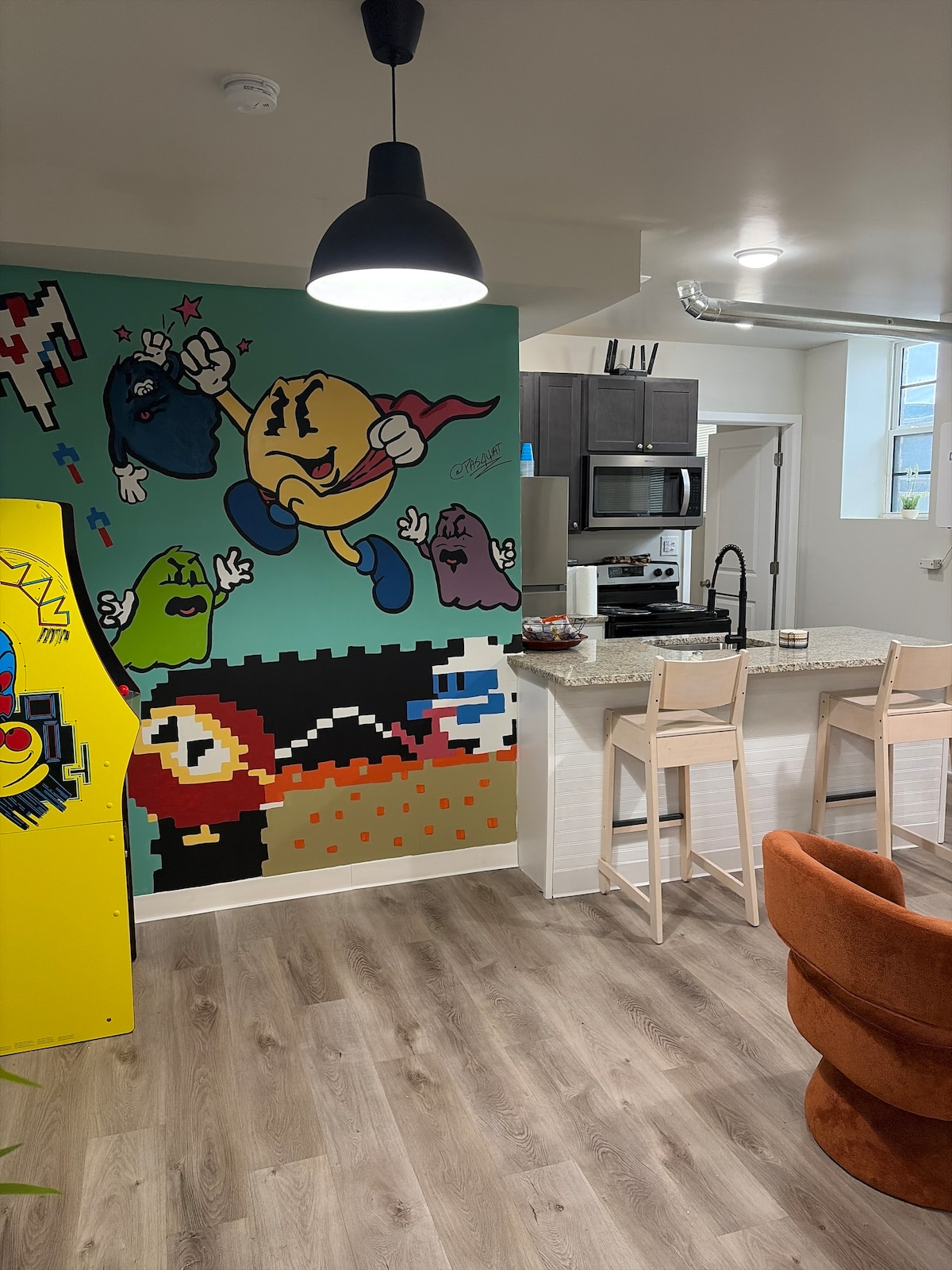 Retro Vibe: Rolig 2BR-vistelse med Pac-Man-väggmålning inuti