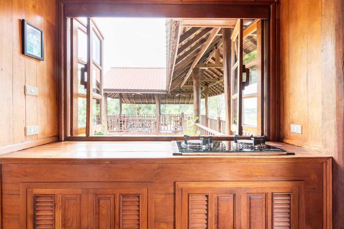 Den elektriska porten öppnas och du flyttar genom den normala världen till din egen Golden Teak Home. Du kommer sannolikt att upptäcka vackra fåglar och fjärilar. När du kommer in, lägg ögonen på altaret, inrym en 300 år gammal burmesisk Buddha, tillsammans med andra artefakter för din personliga välsignelse. Huset har tre sovrum: det stora sovrummet, övervåningen, med eget badrum, inklusive ett badkar; ett annat stort sovrum (alla trä), delar badrum med ett mindre sovrum (alla har utsikt över floden).