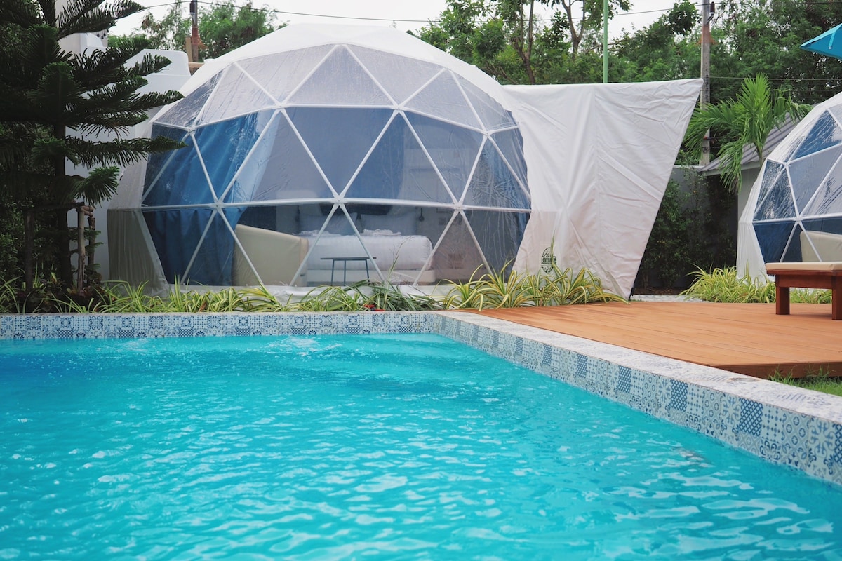 Njut av familjesemester med denna rymliga 2 glampingkupoler ensuite badrum och stor pool i den tropiska trädgården. Kupolen är utformad med detaljer för en lyxig men charmig känsla och utsikt över bergen från poolen. Kupolen är en del av Le Resort & Villas belägen i enklaven Naiharn Beach, fin vit sand och curling surfing vågor. Även om butiker och restauranger ligger bara fem minuters bilresa bort, känns området lugnt och avskilt.