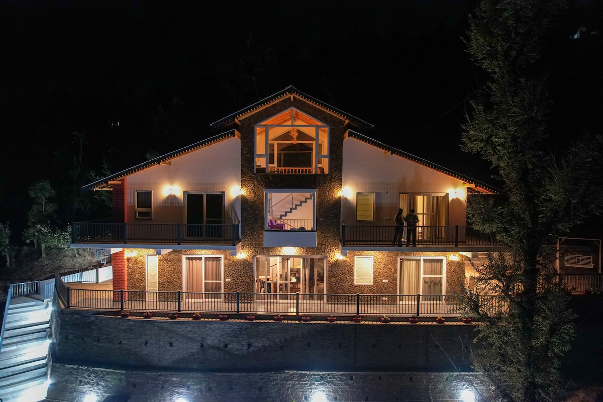 * 3 sovrum, 2 badrum lyxig stuga * Beläget på en kulle topp med den bästa Himalayas snöutsikt och utsikt över skogen i regionen * Många arbetsutrymmen i stugan och utomhus * Gräsmattor runt stugan med gott om utrymme * Fullt utrustat kök med alla vitvaror * Wifi, parkering, smart TV, brädspel * Djupa pittoreska vikfönster, grill och eldstad, solsängar att slappa i, utomhus matställen * Vårdtagare finns på plats