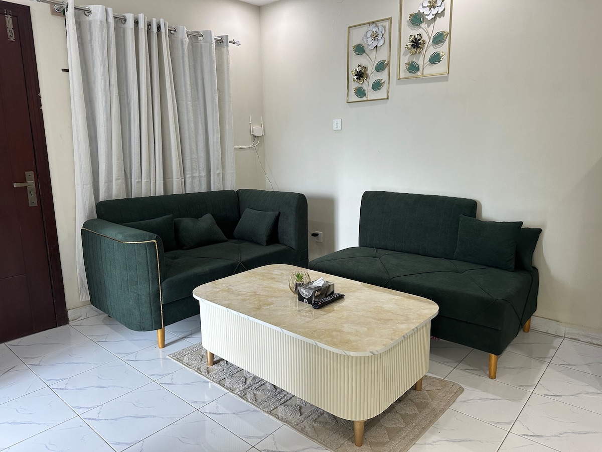 När du går in i denna lägenhet kommer din första reaktion att vara att det är en vacker, elegant och ren lägenhet. Familjemiljö finns tillgänglig. - 5 minuter från EARTH HYPERMARKET 🌎 -15 minuter från flygplatsen 🛫 -2 minuter från (Tandoori restaurang, chai que) - 2 minuter från Haneef medicinska sjukhus 🏥 - källaren till byggnaden har Mart - Hjälpare finns också tillgänglig som kommer att serva och städa ditt rum, leverera allt du behöver, ta dina kläder till tvätt etc.