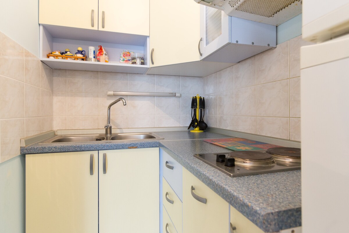 Studiolägenhet är ett bekvämt utrymme för två personer. Här finns ett litet pentry, kylskåp och bord. Den ligger på bottenvåningen. Lägenheten har balkong omgiven av grönska och utsikt över trädgården. Den är dold från utsikten över förbipasserande utom för oss när vi är i trädgården. Studion har eget badrum med badkar.