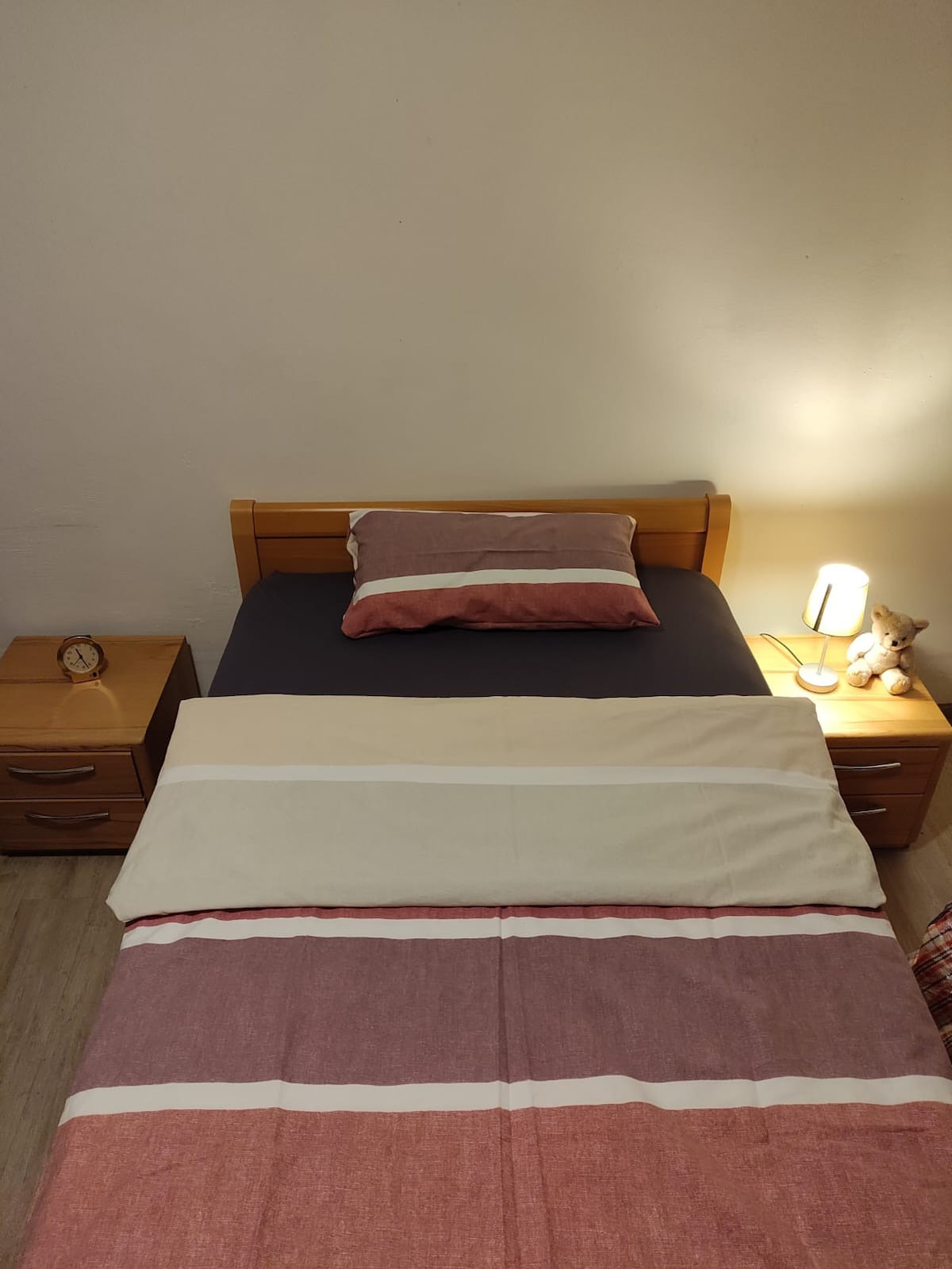 Du kannst hier in einem roten Zimmer wohnen. Es hat ein erhöhtes Bett mit Lampe. Ein Teil des Schranks ist für unser Gäste mit Mineralwasser und Handtüchern/Waschlappen sowie extra Decken Wir haben nun alles, auch das Bad oben erneuert bzw. renoviert, siehe Photos. Übrigens, Frühstück gibt es auch bei uns - im Preis inbegriffen! Die Waschmaschiene kann auch nach mehrtägiger Buchung (ab ca. 5 Tagen) mitbenutzt werden. Ansonsten extra Kosten pro Waschmaschienenladung