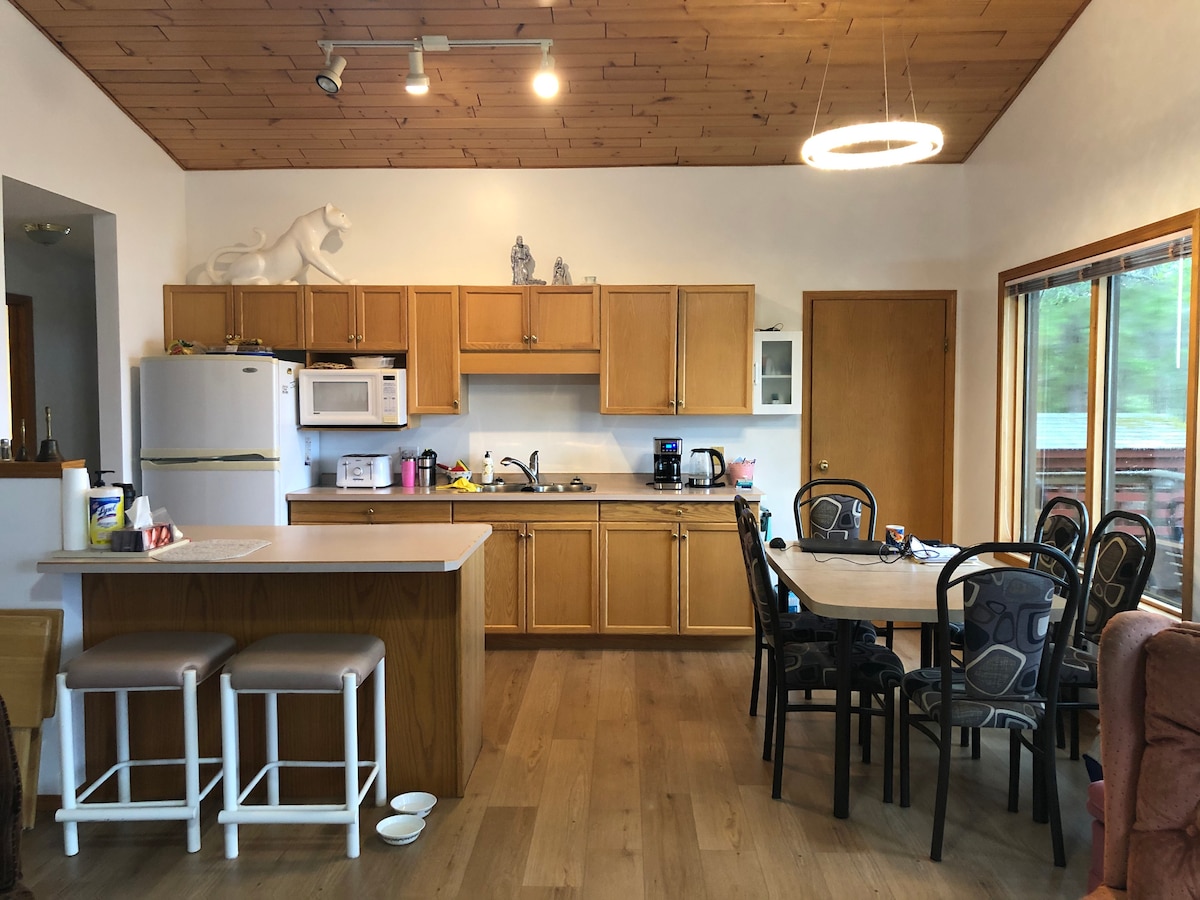 Your family will be close to everything when you stay at this centrally located place in the heart of Sunnyside. 1/2 block to the best beach on Emma Lake. In walking distance to all amenities including restaurants, mini-golf, groceries, ice cream, golf course and bar. Great outdoors space. Deck with furniture and a BBQ. Kids play house with lots of toys. Great park with playground right across the street. And also a firepit and chairs, along with firewood so you can enjoy evening outside.