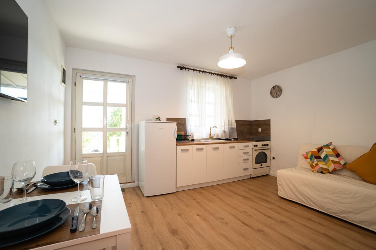 Lägenheten är utformad för att rymma 4 personer, total bostadsyta är 28 m2 + terasa od 15 m2. Lägenheten har ett kök, en matsal, 2 sovrum och ett badrum med toalett och utomhusdusch med varmt vatten. Stor terrass med trädgårdsbord och stolar kommer att lysa upp eftermiddagen tillbringas i skuggan och frisk luft. Till ditt förfogande finns en parkeringsplats. Du hittar vår utomhuspool på 35 m2 särskilt trevlig. Poolen är utrustad med utmärkta solstolar och parasoll.