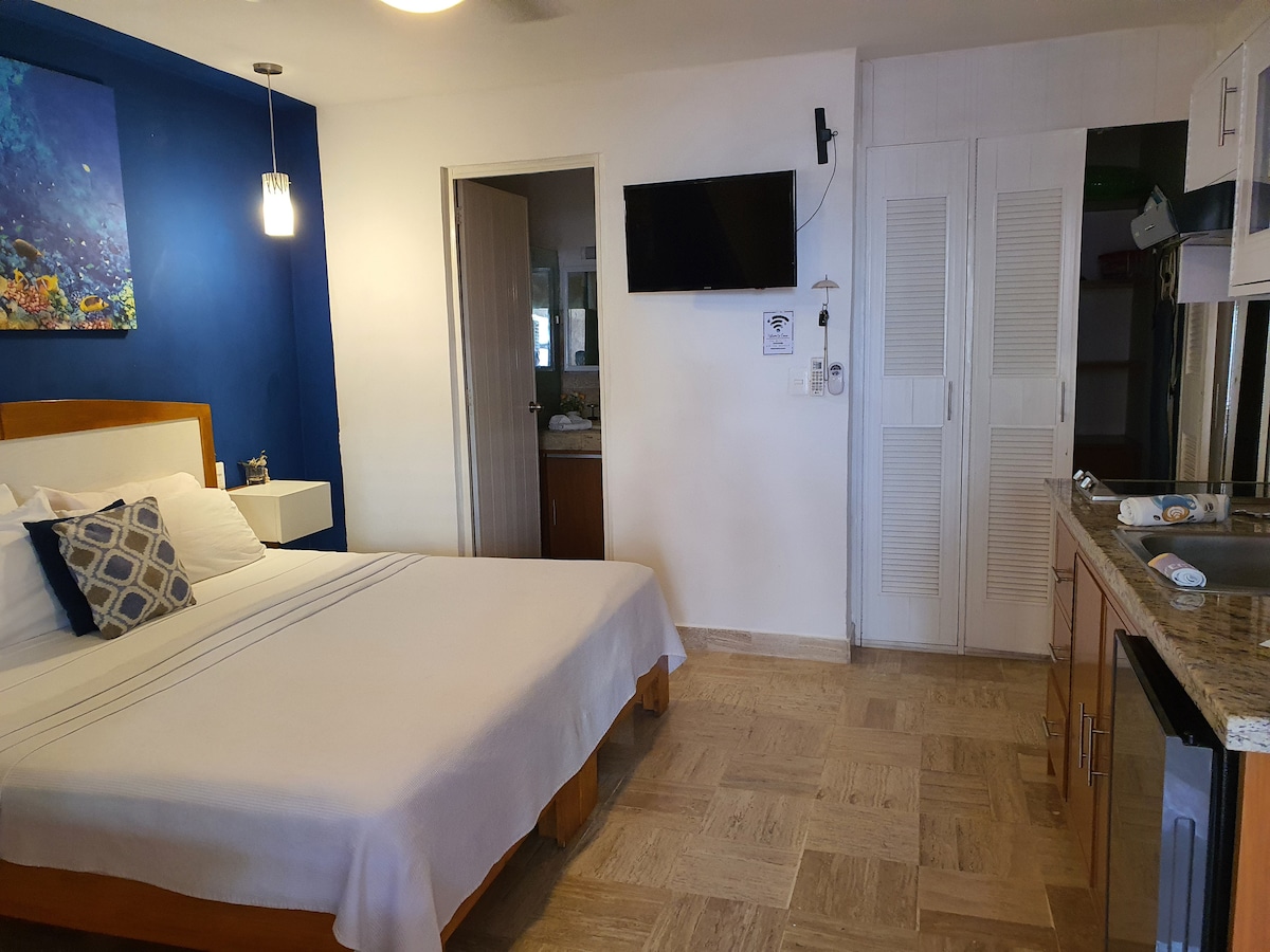 Estudio ubicado en primer nivel con vista al mar y piscina . Cuenta con 2 camas Queen , sofa cama, balcon , aire acondicionado , Wifi , televisión (Neflix, Hbo), cocina equipada ( estufa eléctrica, mini bar, dispensador eléctrico de agua, cafetera, horno de microondas , licuadora, loza, cristalería , plaque y utensilios de cocina para 5 personas). Limpieza a la habitación incluida cada tercer dia. Cargos adicionales: se cobrarán sabanas , toallas y/o equipo dañado, manchado o perdido.