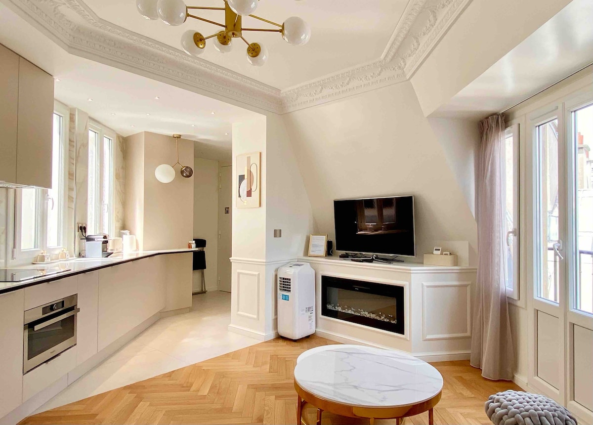 Architect design 2 room apartment, Safest and most luxurious area of Paris 7th facing a one star Michelin restaurant. Shops, museums, Eiffel Tower, Invalides, Alexandre III bridge, Seine river. Super Quiet, classy, safe Parisian building. One bedroom, chimneys and desk, luxury bed & bedlinen, Italian design bathroom, living room, stylish sofa, chimney, Ultra high speed WIFI, tv 900 channels, luxury kitchen. Wooden floor, mirrors. Double-glazing windows. Air Conditioning +air purifier
