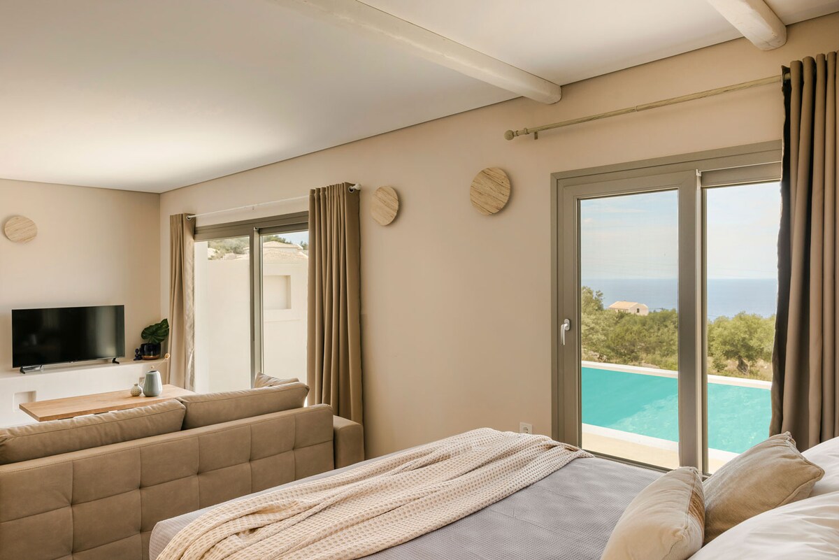 Stunning 1-bedroom villa overlooking stunning Assos Bay, Kefalonia. Just minutes from the charming villages of Assos and Fiskardo, and a breathe away from the beautiful Myrtos Beach! this serene retreat features a private pool, elegant interior design, and breathtaking sea views. Perfect for couples seeking tranquility and luxury in a unique Ionian setting. Enjoy sunsets from your terrace, star gazing at night! dip in the pool, or explore the nearby beaches and tavernas—paradise awaits.